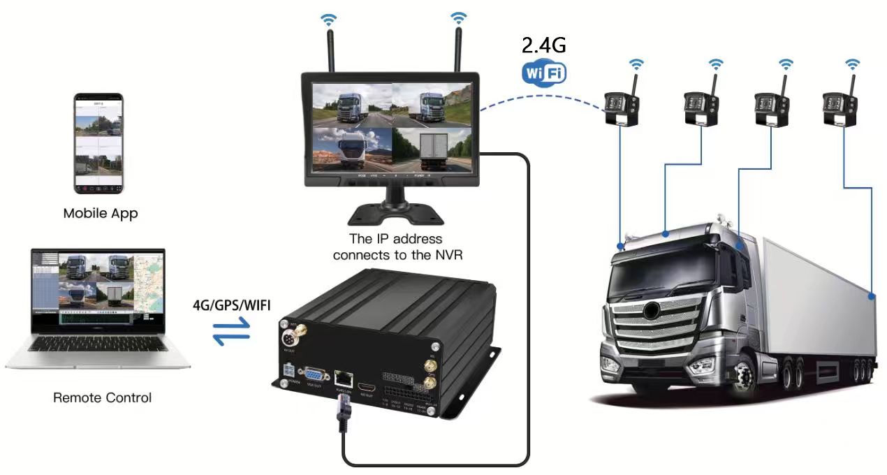 Carleader 10.1 Inch 4CH Wireless HDD Mobile NVR System, sistem NVR seluler canggih sing dirancang kanggo manajemen armada. Sistem nggunakake kamera IP nirkabel 4pcs dipasangake karo monitor kabel 10,1 inci liwat sinyal 2,4GHz, banjur sambungake montior lan NVR nganggo konektor RJ45. ora perlu kanggo masalah kabel ekstra, luwih efektif kanggo instalasi lan manajemen armada.
