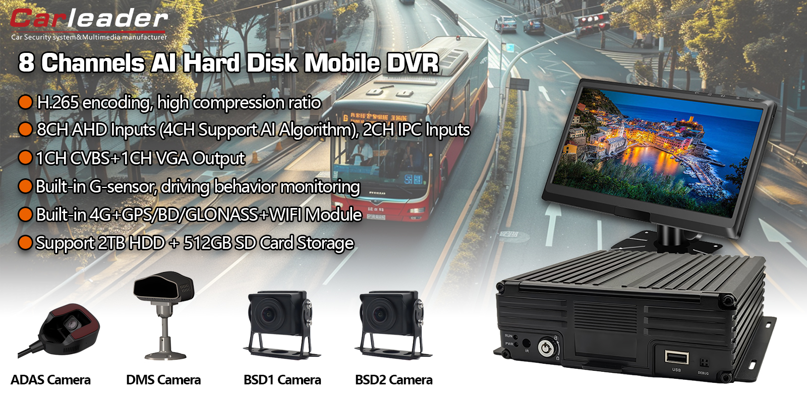 Carleader8CH AI HDD Mobile DVR Dhukungan ADAS+DMS+BSDminangka solusi sampurna kanggo armada komersial, transportasi umum, logistik, lan kendaraan khusus sing mbutuhake:
