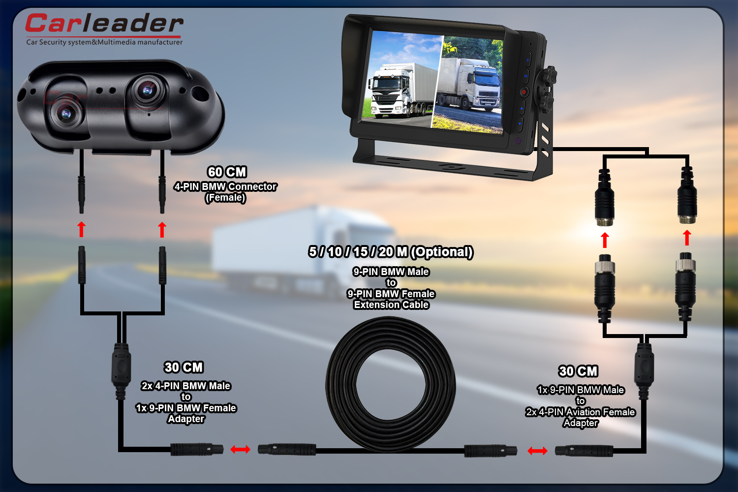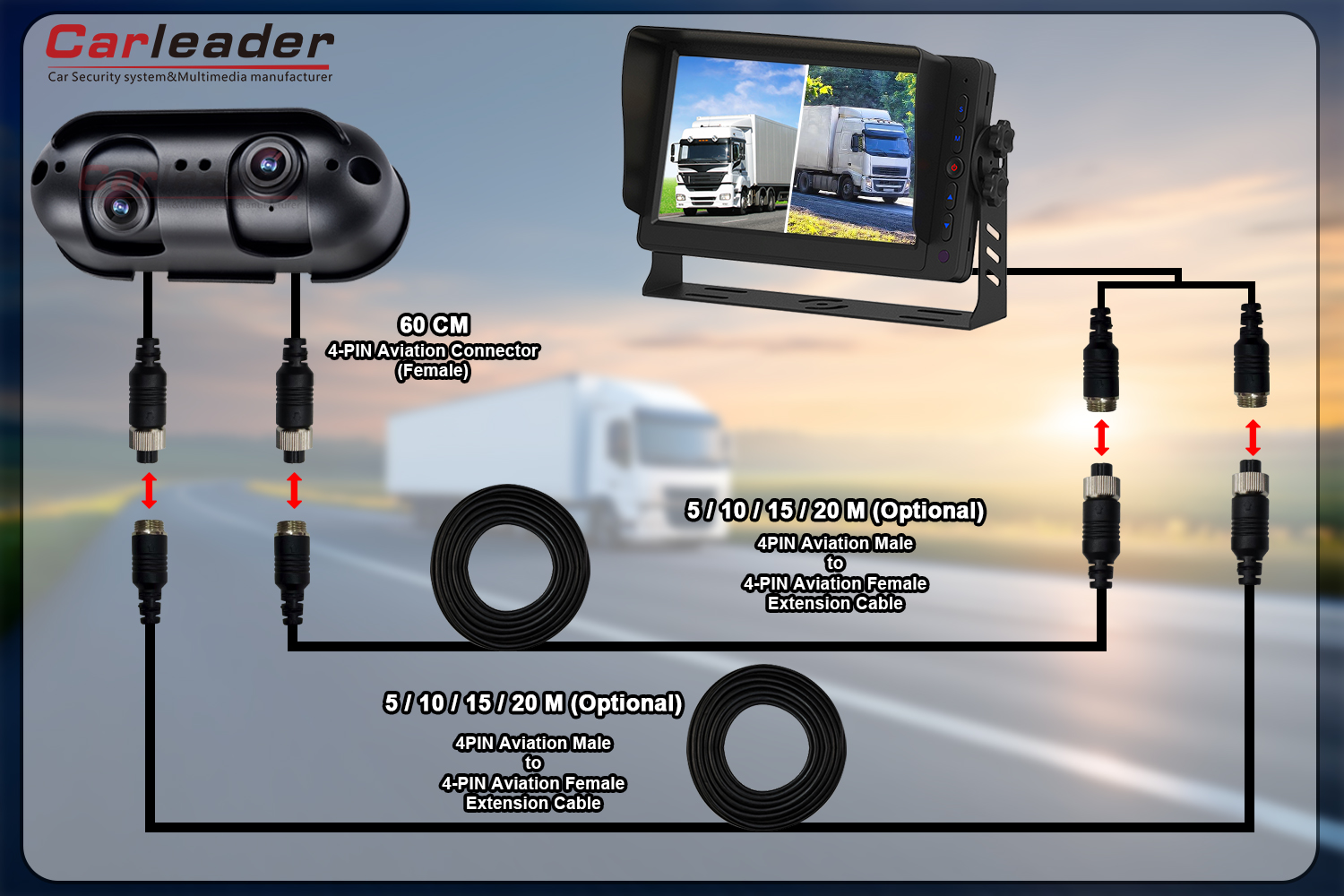 Carleaderbakal nawakake rong solusi kabel sing beda kanggo Starlight AHD Dual Lens Heavy Duty Reversing Camera, supaya cocog karo kabutuhan kabel sing beda: