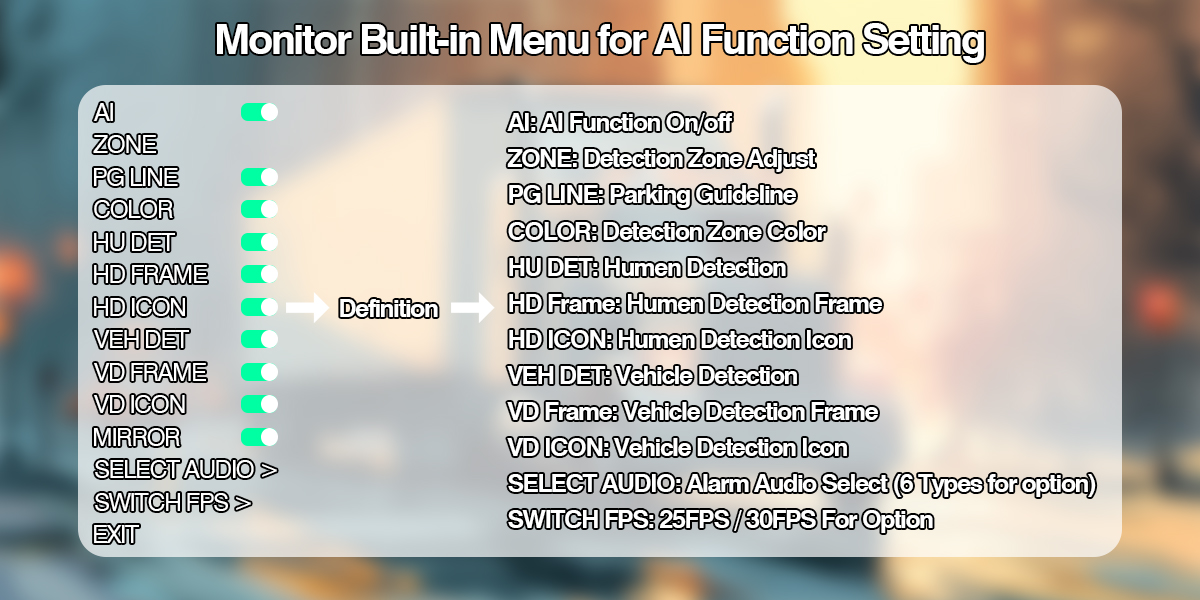 Carleader7 Inch AI BSD Blind Spot Detection Monitoring System Dhukungan AI Kalibrasi, solusi kamera AI sing ndhukung deteksi pejalan kaki, deteksi kendaraan, nambah safety nalika nyopir, ngawasi nganggo menu kalibrasi AI sing dibangun, ngidini pangguna nyetel area deteksi, tampilan warna zona deteksi urip/mati, jinis audio weker, tampilan lambang kendaraan lan pejalan kaki, pilihan obyek deteksi, lsp.