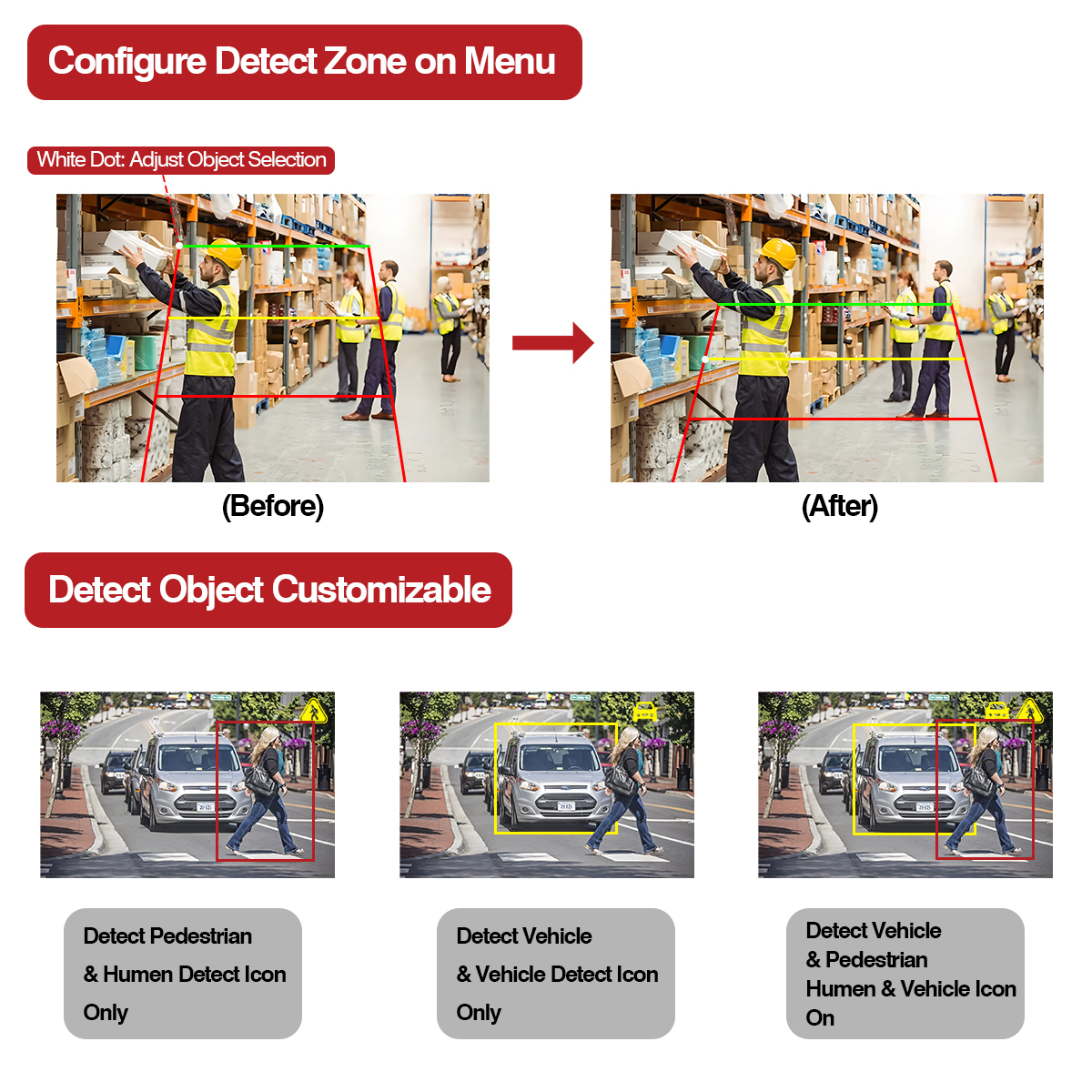 Ngawasi built-in AI Kalibrasi Menu, kabehPangguna bisa nyetel ukuran area deteksi (Zona Deteksi) kanthi bebas ing layar supaya pas karo kahanan tampilan sing beda amarga posisi lan sudut instalasi sing beda. Saliyane pangaturan area deteksi, ana fungsi AI liyane sing ngidini pangguna ngganti setelan (Mangga priksa gambar ing ngisor iki).