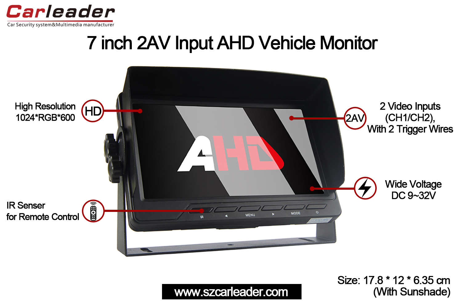 CarleaderMonitor Kendaraan Input 7 Inch AHD 2CHnggabungke linuwih, kajelasan, lan versatility ing desain kompak lan awet, nggawe iku pilihan banget kanggo kabutuhan profesional lan pribadi ngawasi kendaraan.