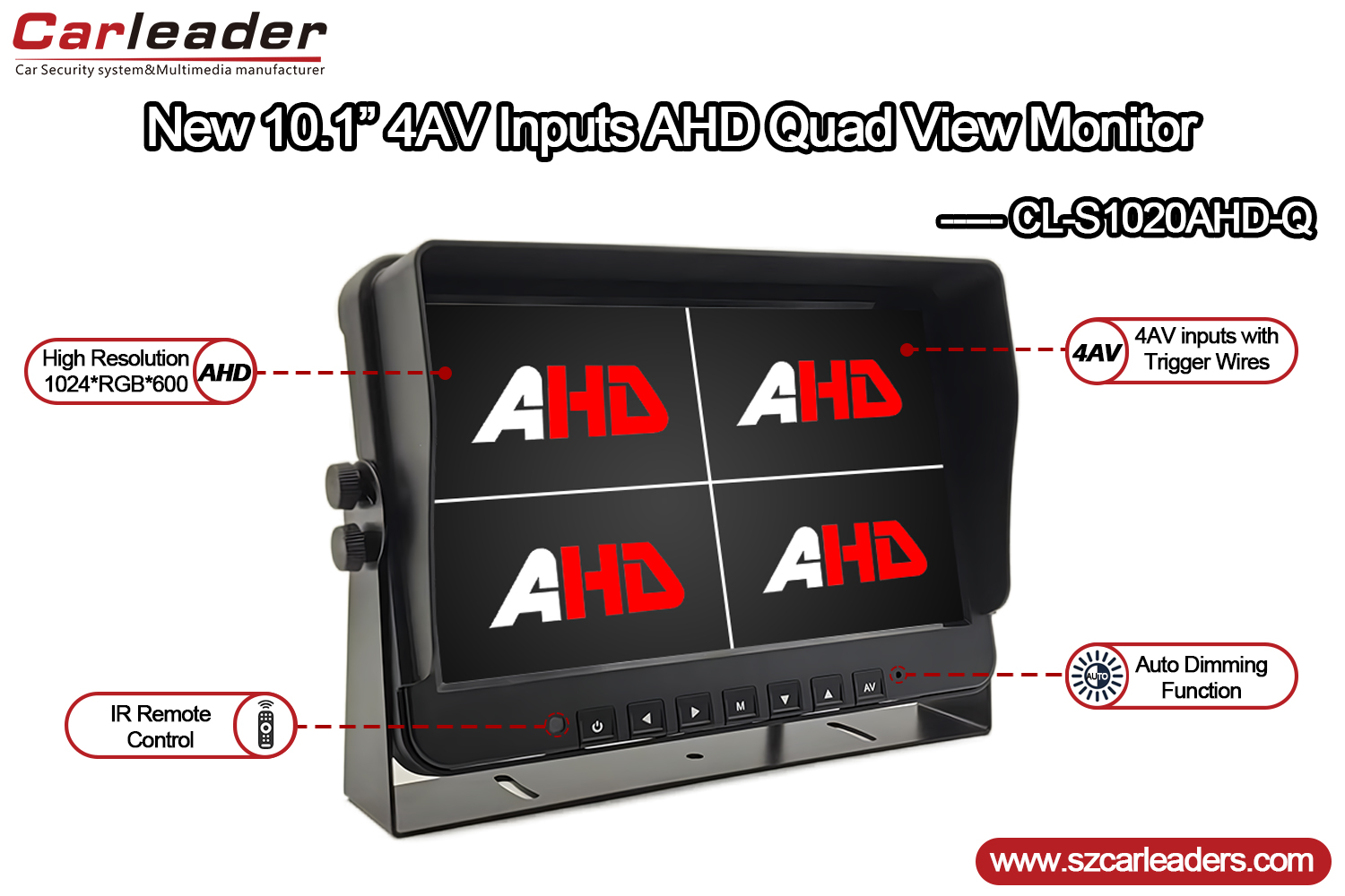 CarleaderMonitor AHD Kendaraan Heavy Duty 10,1 Inch 4CHyaiku Monitor Quad AHD 10.1 inci kanthi kinerja dhuwur sing dirancang kanggo ngawasi video multi-saluran sing dipercaya lan serbaguna. Nampilake panel digital gedhe kanthi resolusi 1024xRGBx600 lan padhange 550 cd/m², iki menehi gambar sing cetha lan sregep sanajan ing kondisi cahya sing tantangan.
